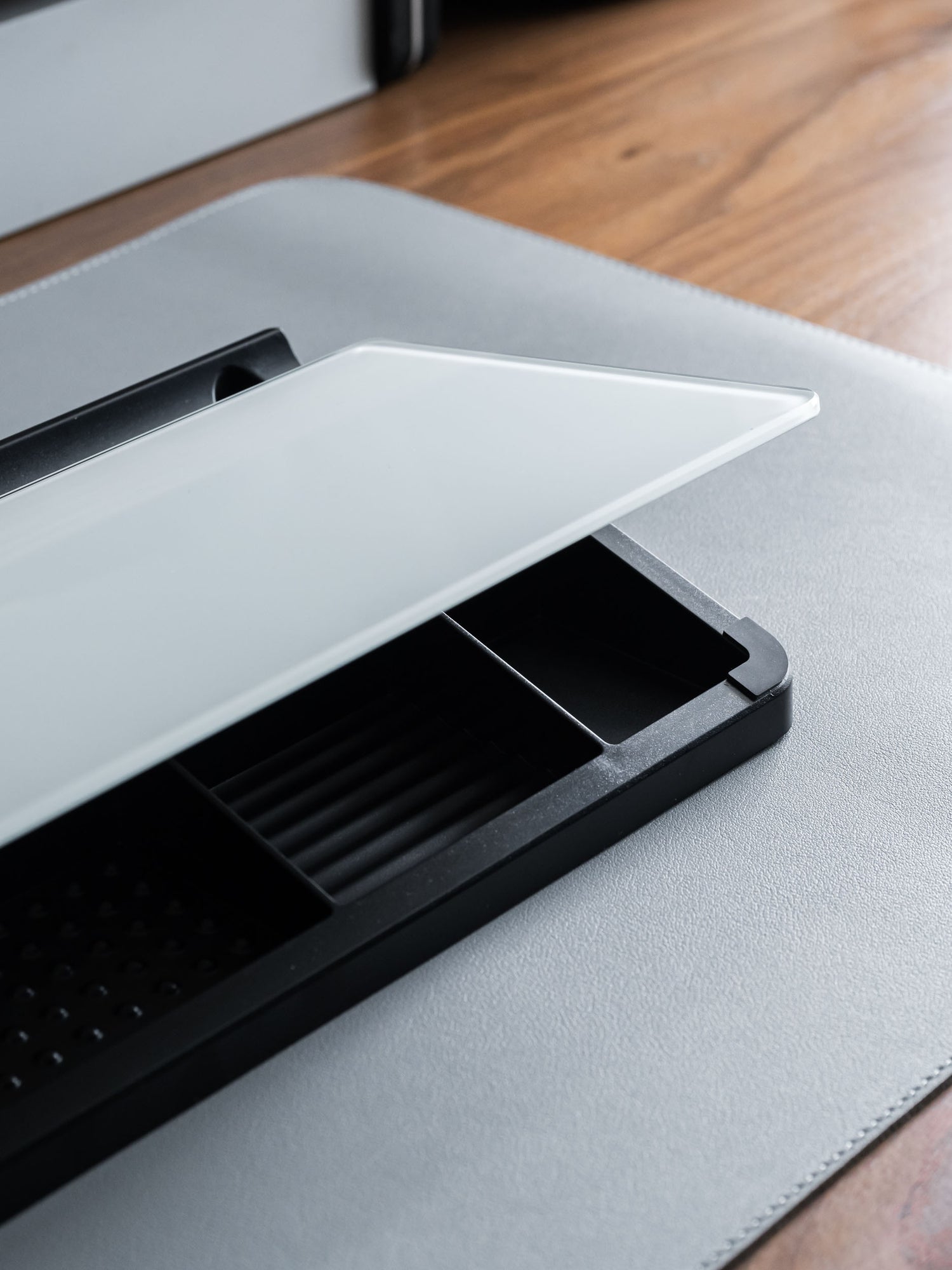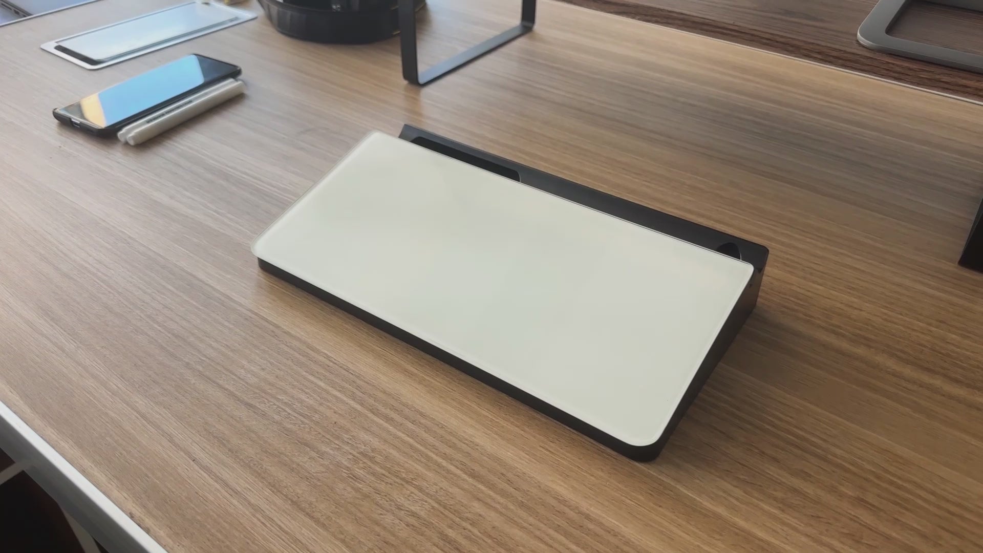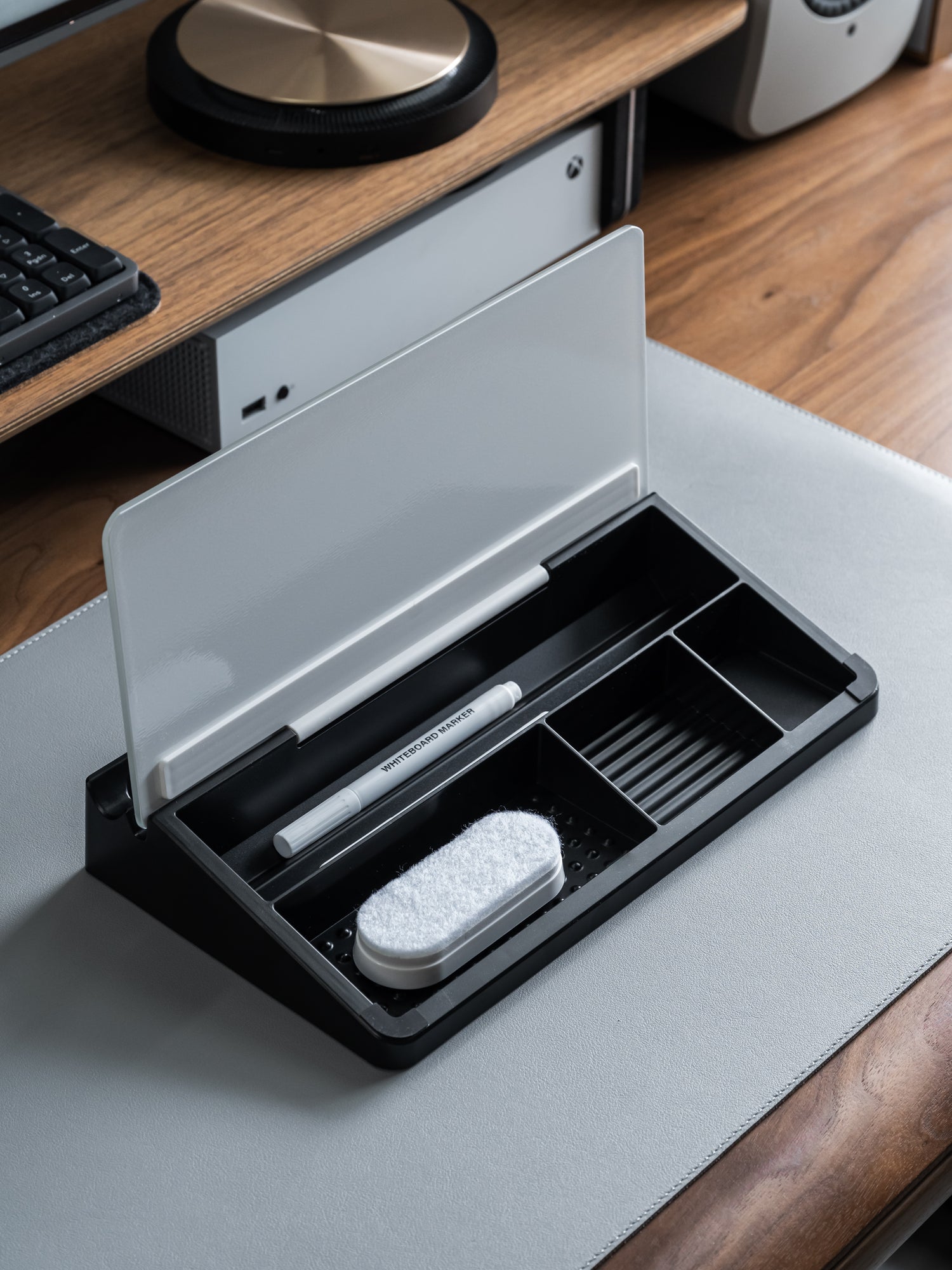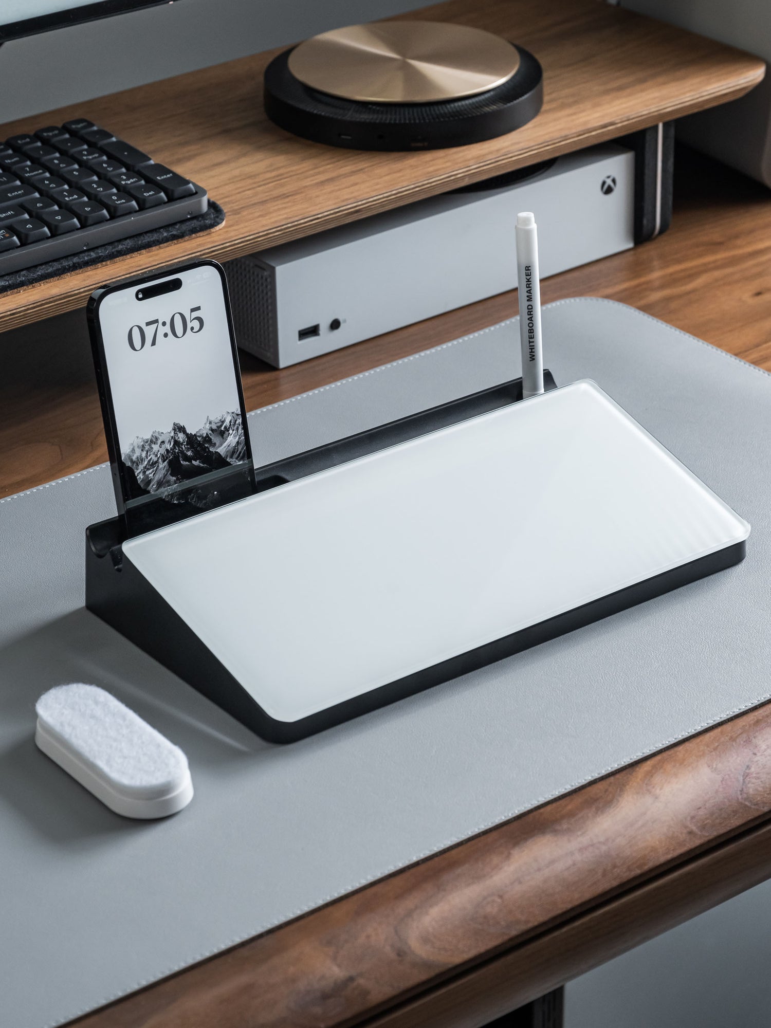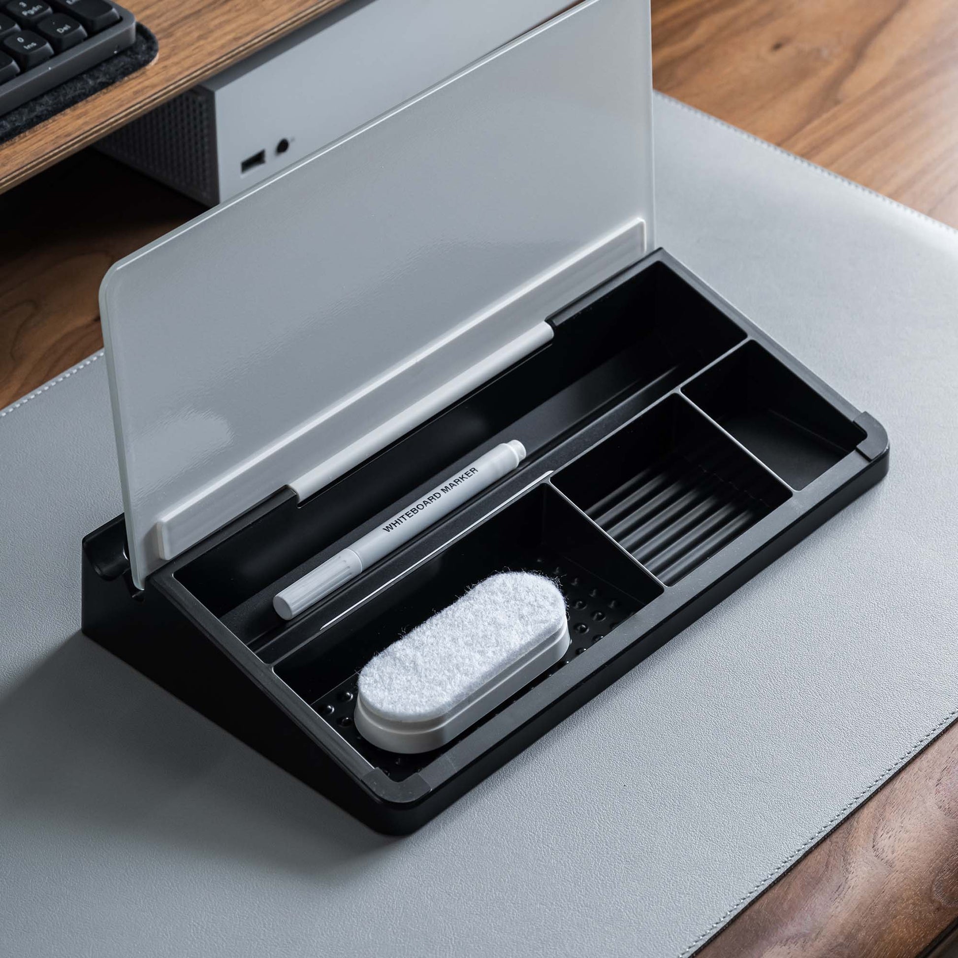 The phone slot and pen tray integrated into the whiteboard's frame are thoughtful design elements that enhance functionality and convenience. By keeping frequently used tools well within reach, these features promote efficiency and organization in any workspace. Whether jotting down notes, sketching ideas, or making important calls, having easy access to your essentials can help streamline your workflow and boost productivity.